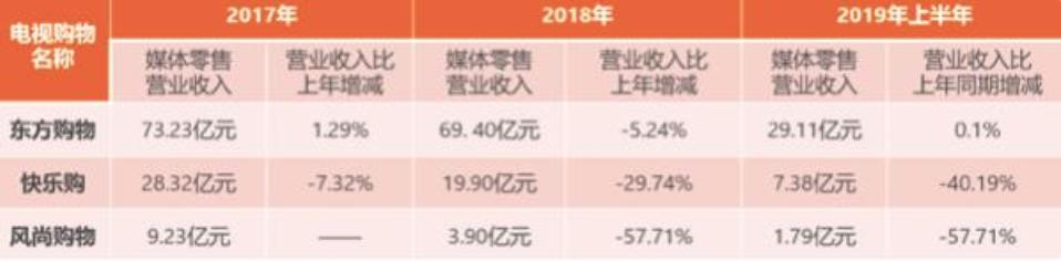 2018年官方报告尚未出台,但专注中老年消费群体研究的Ageclub,对国内电视购物上市公司2017-2019年近三年的年报数据进行对比分析发现,包括电视购物在内的媒体零售营业收入逐年递减,风尚购物的媒体零售收入甚至减少50%以上。