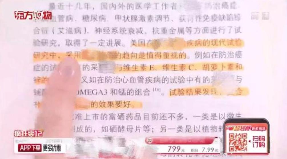 12月3日,东方购物在卖一款保健品时,拿出发表相关科研文献的国外多家研究机构的名单,并用橙色画出研究中证明其有益的语句。