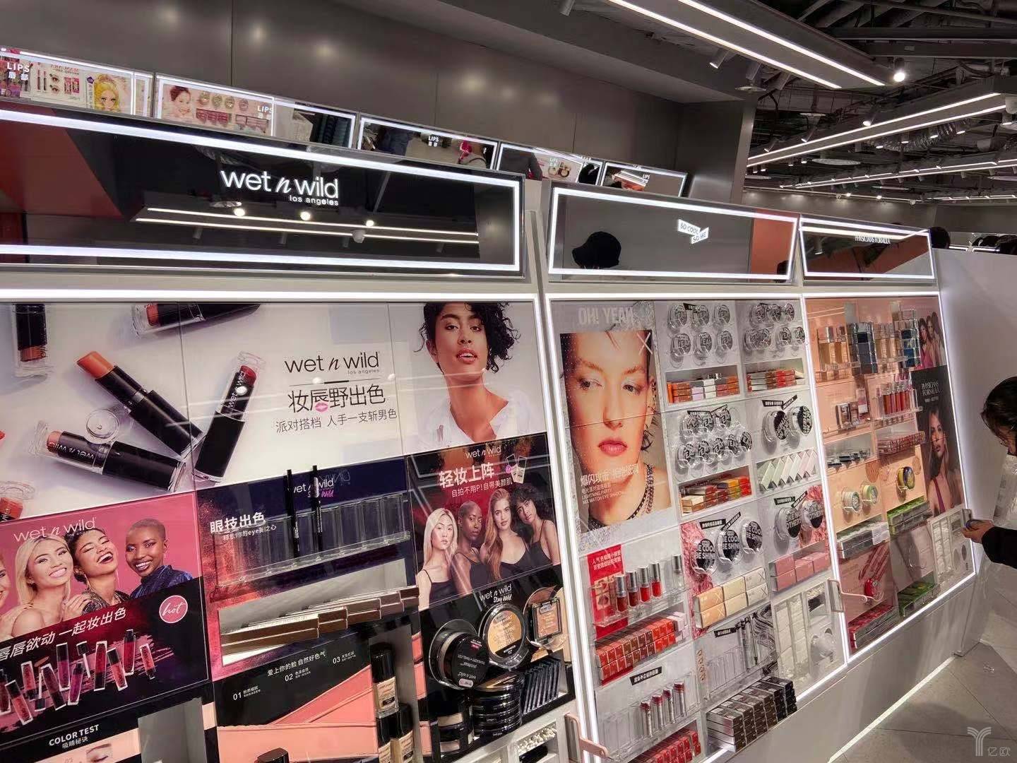 在陈列方面,品牌按照品类+品牌区混合摆放。一进门,卡婷专柜的国货口红,吸引了不少年轻人试色。走进门店,设置了唇部、眼部、脸部三个主要区域,多个专柜依次摆放各品牌商品,热销产品被标注。