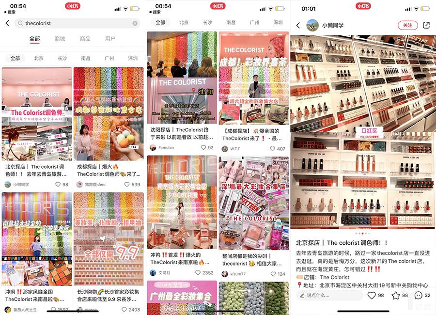 在小红书上,THE COLORIST调色师俨然成为网红打卡的圣地。两处特别的设计,彩妆蛋墙、口红墙是年轻人打卡拍照的背景图。此外,还创造性地打造了首个彩妆店播的新玩法,将内容、种草与互动结合到一起。在北京首店由于面积限制,没有放置这些装置,不过门店颜值依然很高。在亿欧逛店的过程中,有不少女生,挑选合适的角度和光线,让朋友帮忙拍照。