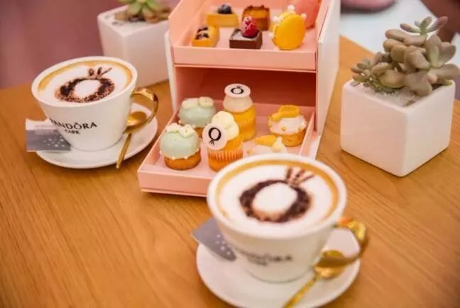其中,北京店是一家两层旗舰店,一楼是精品店,二楼是咖啡店, 以服务女性的角度出发,咖啡店以品牌标志性的粉色为主,粉色窗帘、粉色沙发,粉色甜品,为顾客提供足够的私密空间。这里的咖啡、饮品、甜品、下午茶套餐,甚至餐具都会被印上潘多拉的品牌LOGO图案,客单价在70元左右。