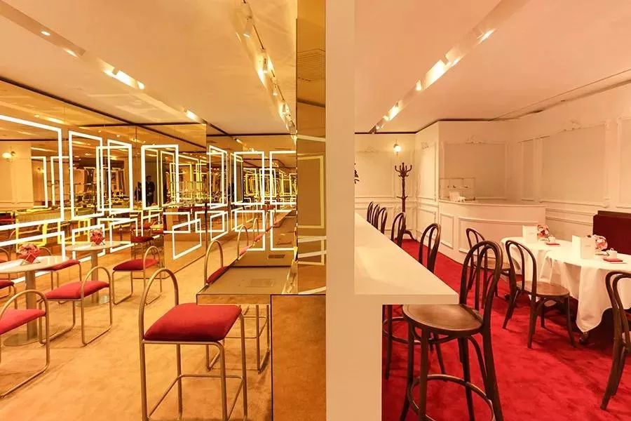 今年4月, Cartier卡地亚也在上海K11的品牌概念店中开了限时咖啡店。这家咖啡店的设计遵循了““双面”的主题,一面是摩登金色镜面空间,一面是优雅法式风格。